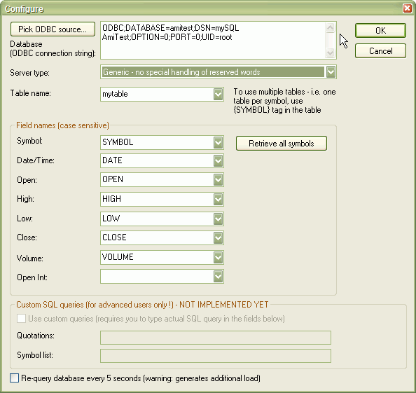 8. (Optional) You may press "Retrieve symbols" button to get the list of symbols transferred from the external database to AmiBroker
